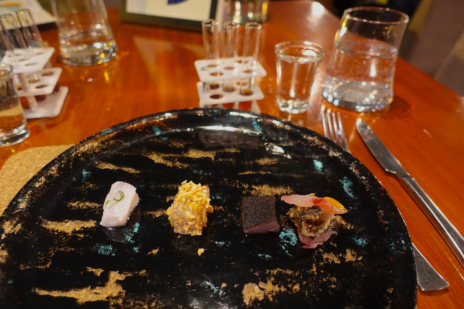 The fourth course was snapper prepared in four different ways served with test tubes containing four different cold coffees. The idea was to take a mouthful of snapper and then sample how the coffee tasted along with the fish. The result was that the coffee tasted quite different depending on how the snapper was prepared.
