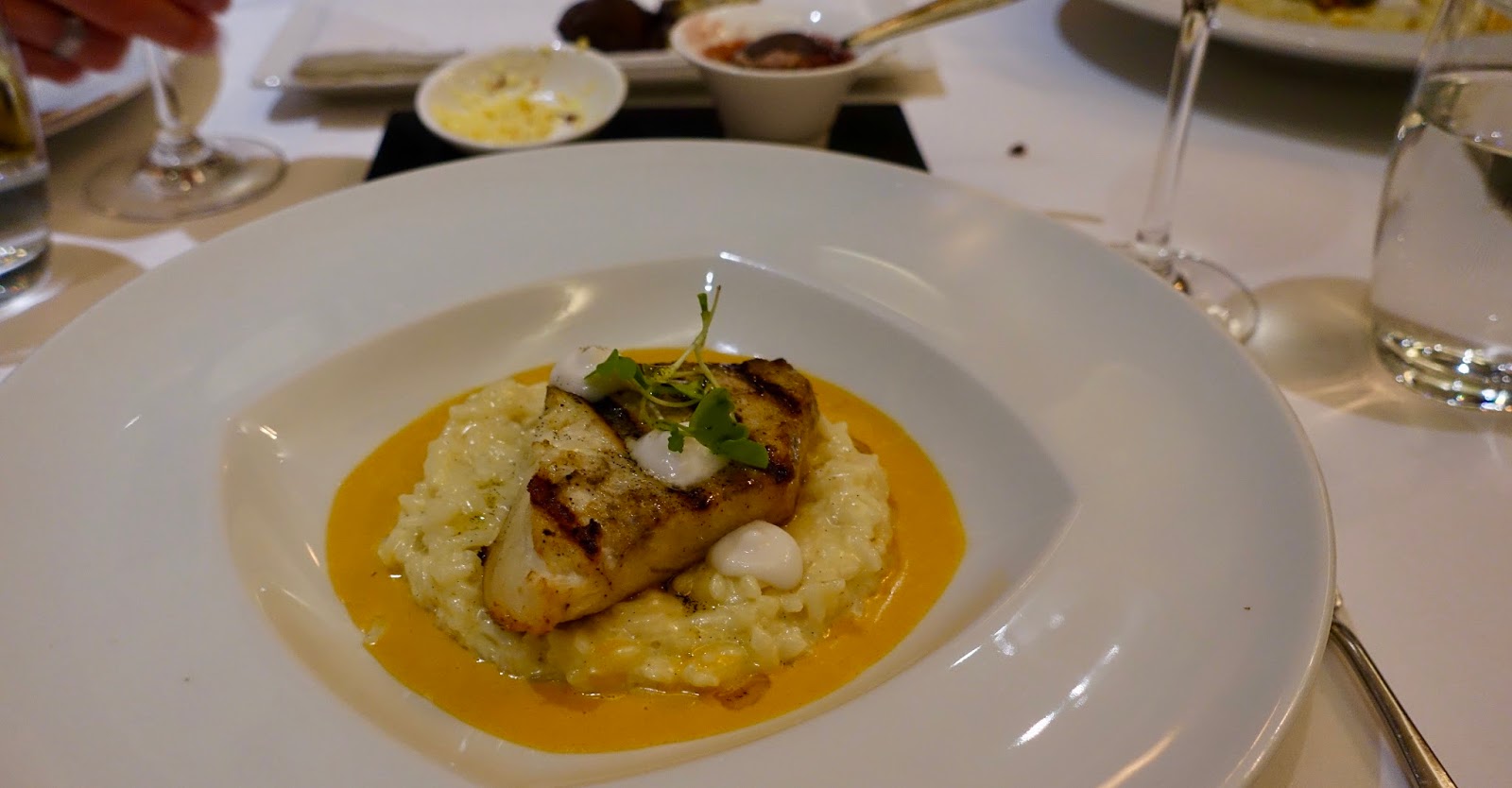 Second, a main course is pictured, a superb grilled Barramundi fish fillet with vanilla infused butter risotto, coconut and smoked pimento sauce.